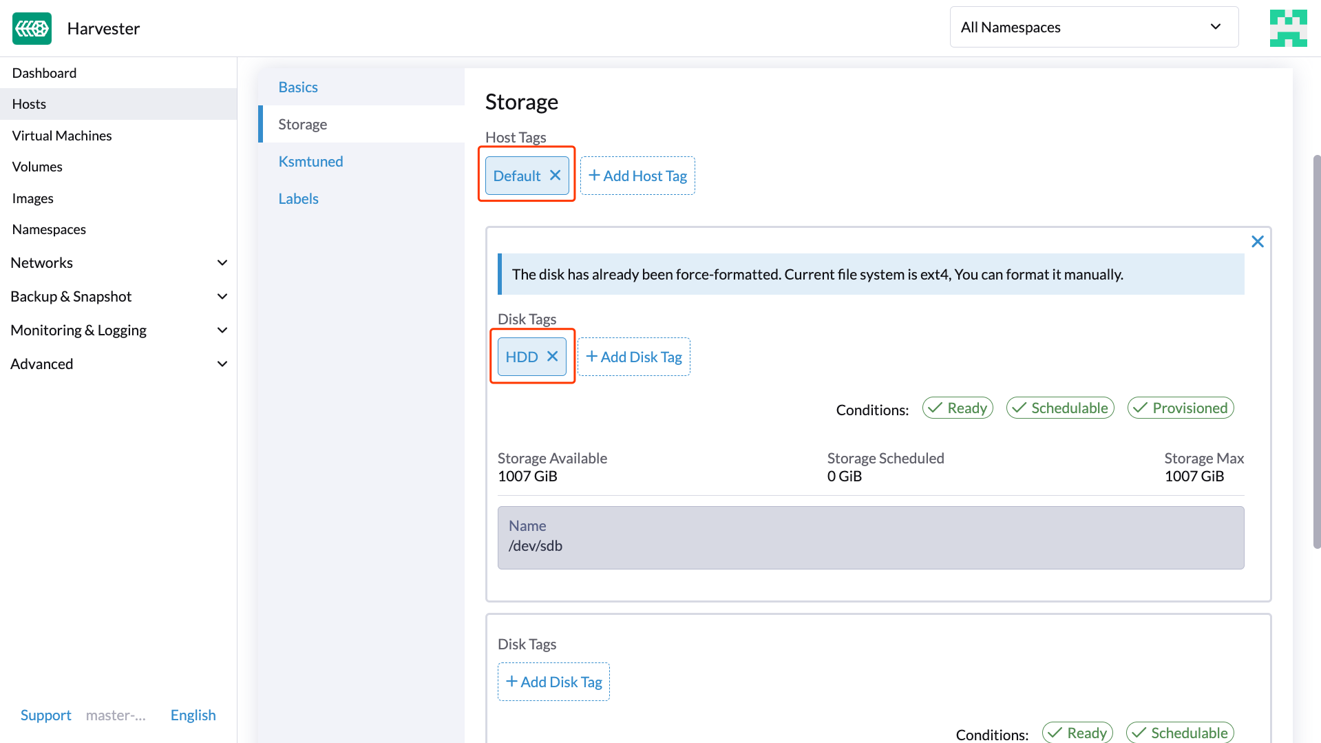 First, add your HDD on the Host page and specify the disk tags as needed, such asHDD or ColdStorage. For more information on how to add extra disks and disk tags, see Multi-disk Management for details.
