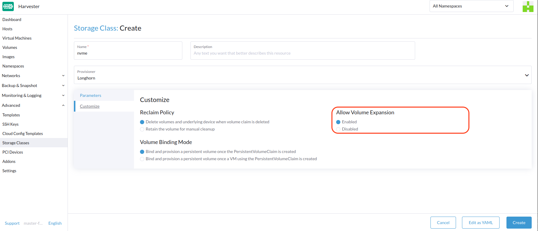 Volumes can be configured to be expandable. This feature is Enabled by default, which allows users to resize the volume by editing the corresponding PVC object.