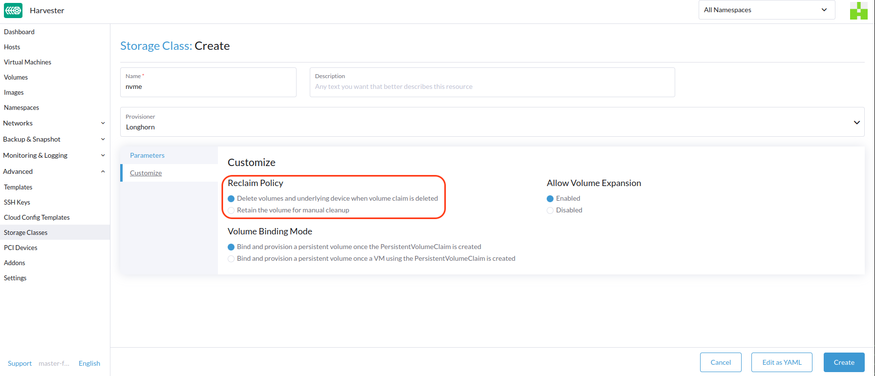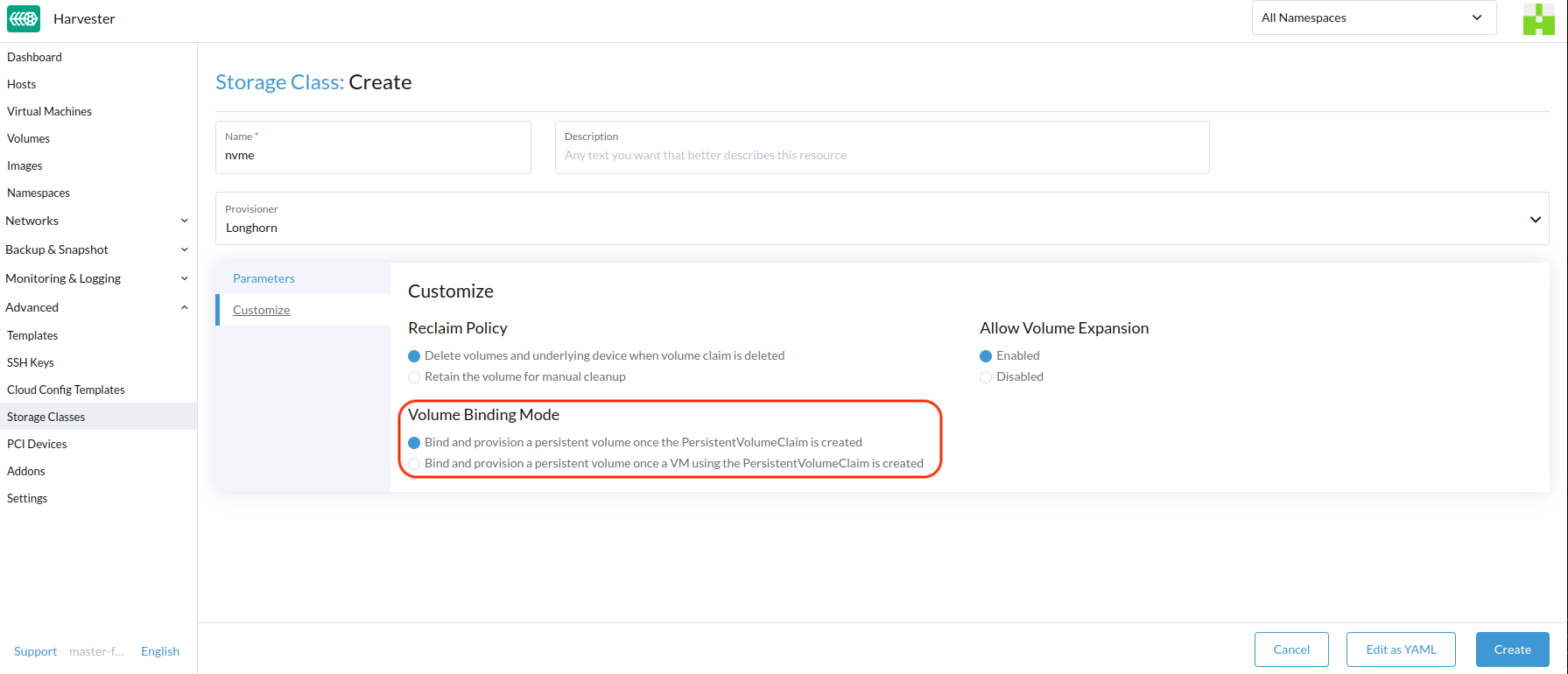 Immediate: Binds and provisions a persistent volume once the PersistentVolumeClaim is created.WaitForFirstConsumer: Binds and provisions a persistent volume once a VM using the PersistentVolumeClaim is created.
