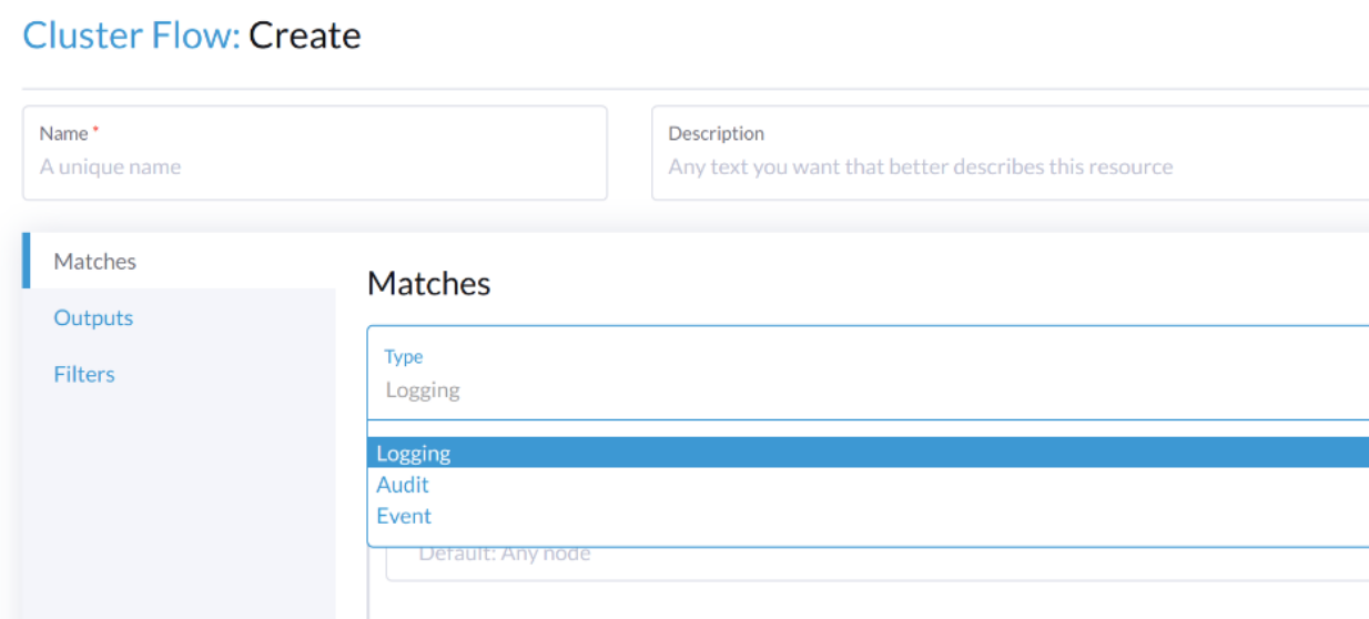 Matches allow you to filter which logs you want to include in the Flow. The form only allows you to include or exclude node logs, but if needed, you can add other match rules supported by the resource by selecting Edit as YAML.