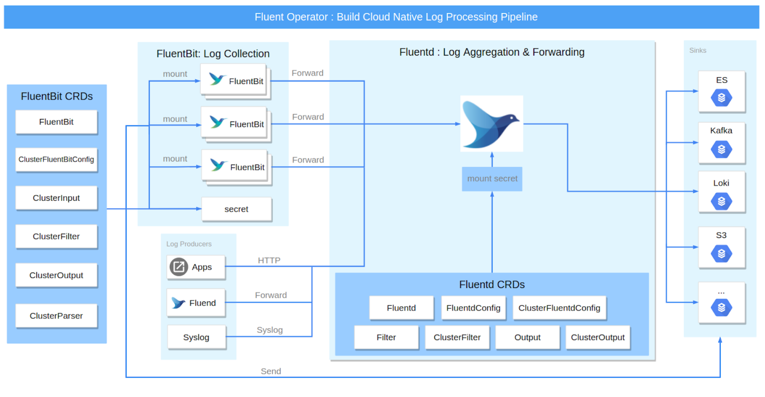 Underneath Banzai Cloud's logging operator are fluentd and fluent-bit, which handle the log routing and collecting respectively.