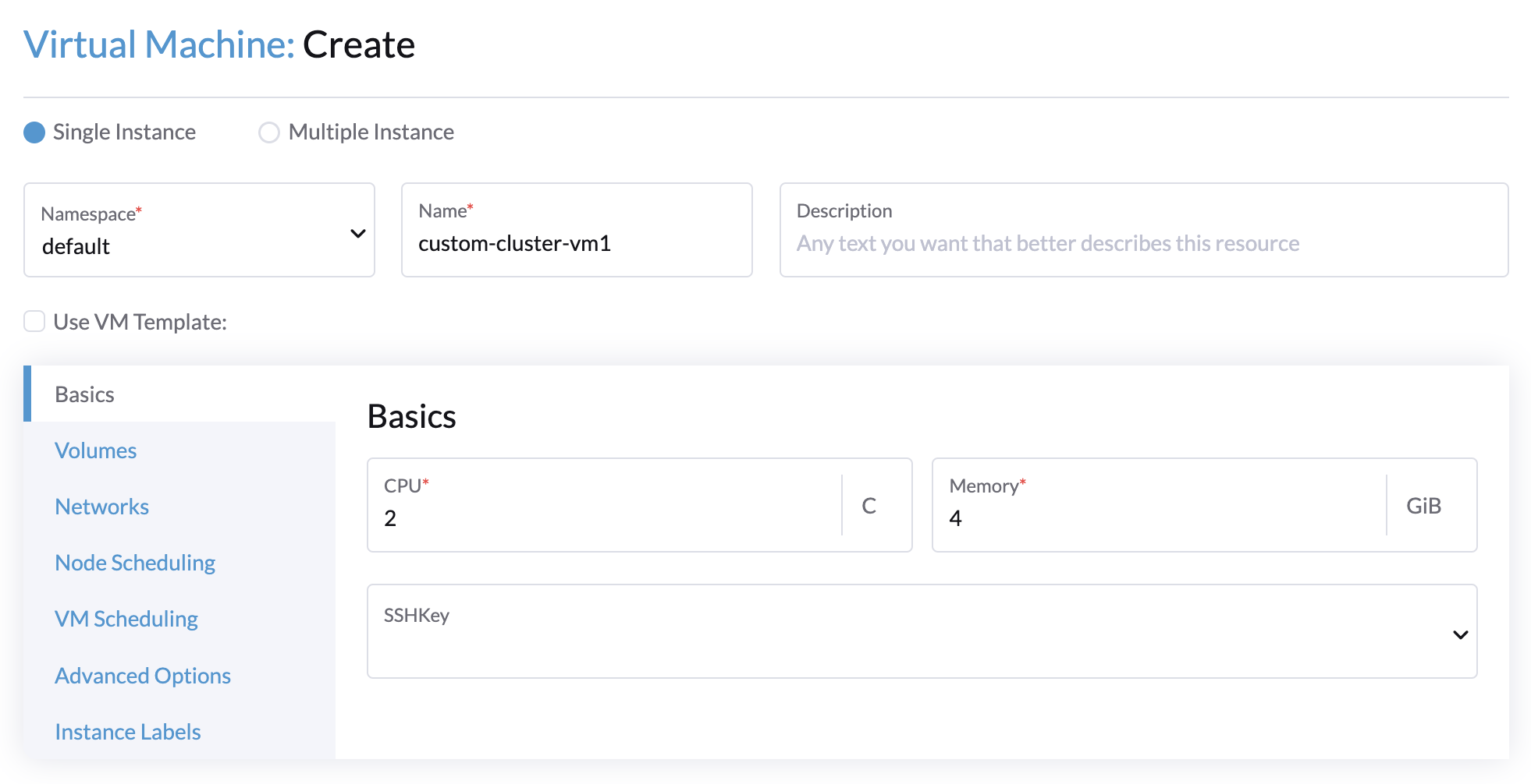 Basics tab: The minimum requirements are 2 CPUs and 4 GiB of RAM. The required disk space depends on the VM image.