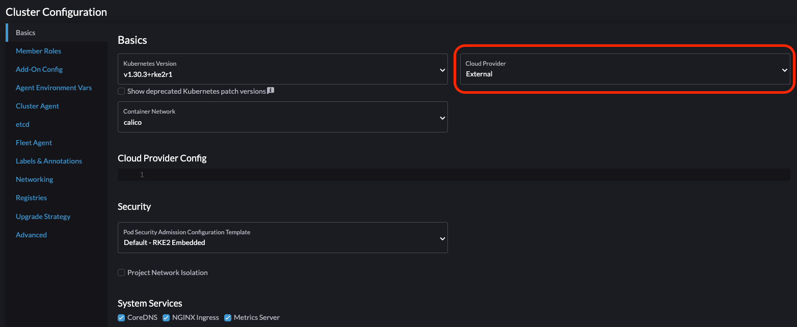 permissions: '0644'On the RKE2 cluster creation page, go to the Cluster Configuration screen and set the value of Cloud Provider to External.