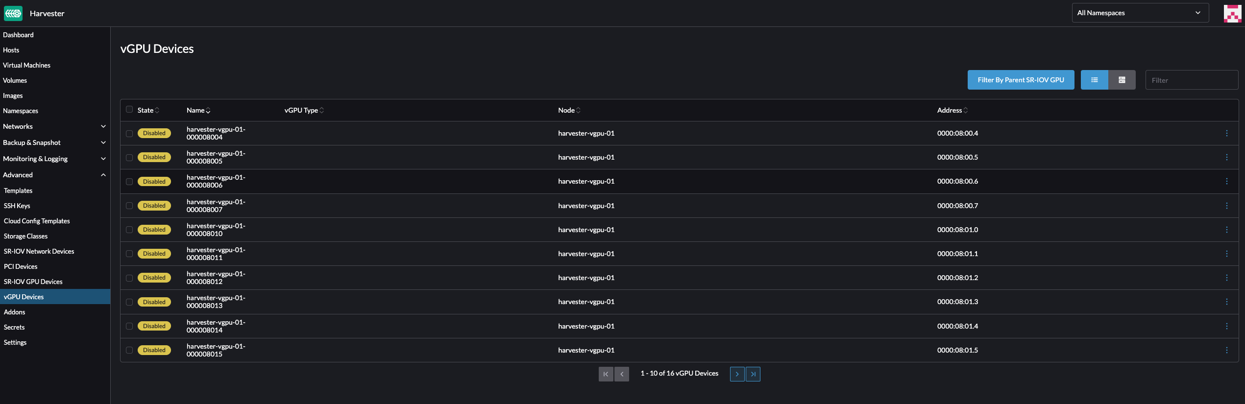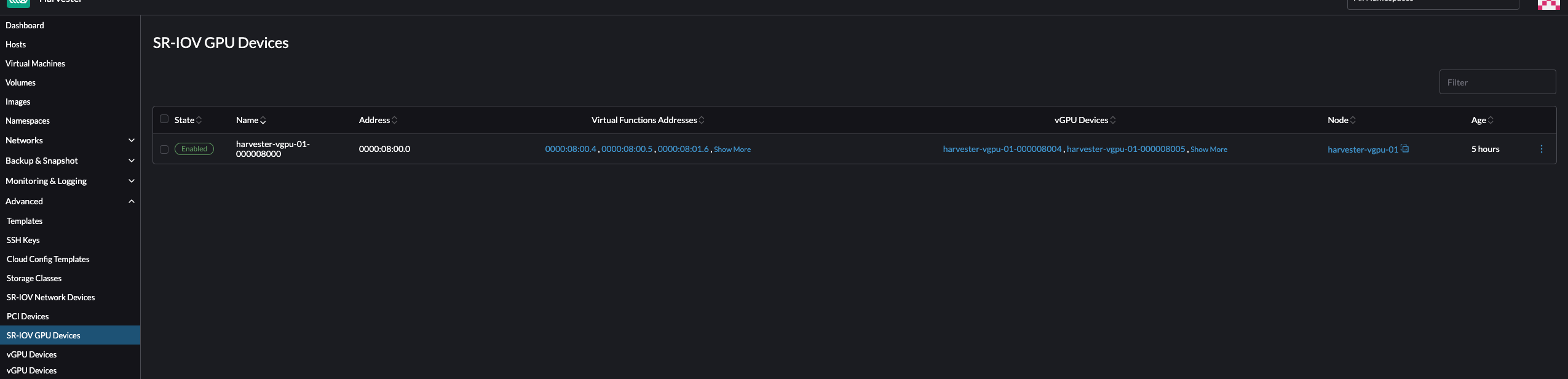 - On the Harvester UI, go to Advanced > SR-IOV GPU Devices and verify the following:
