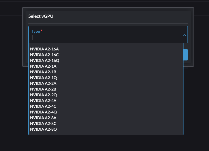 If you select the NVIDIA A2-4Q profile, you can only configure 4 vGPU devices. Once those devices are configured, you cannot select any profiles for the remaining vGPUs.